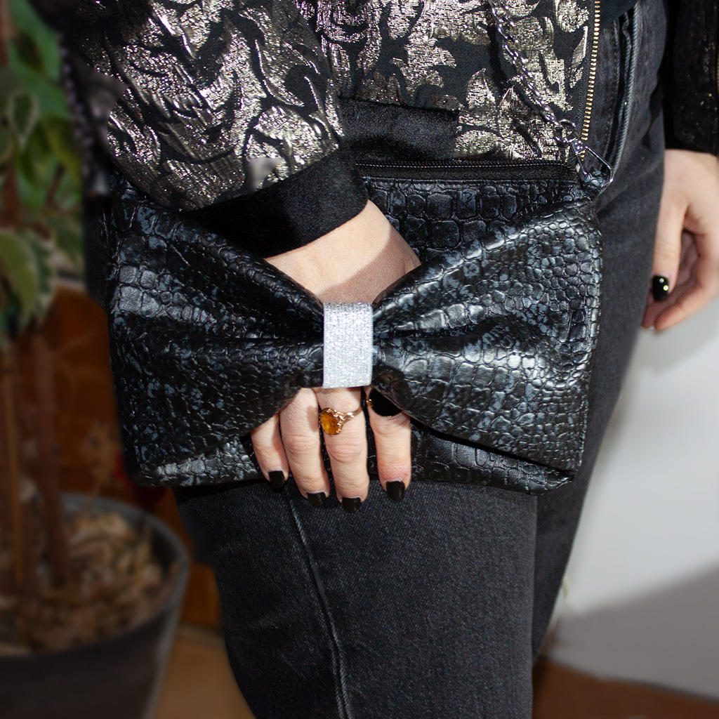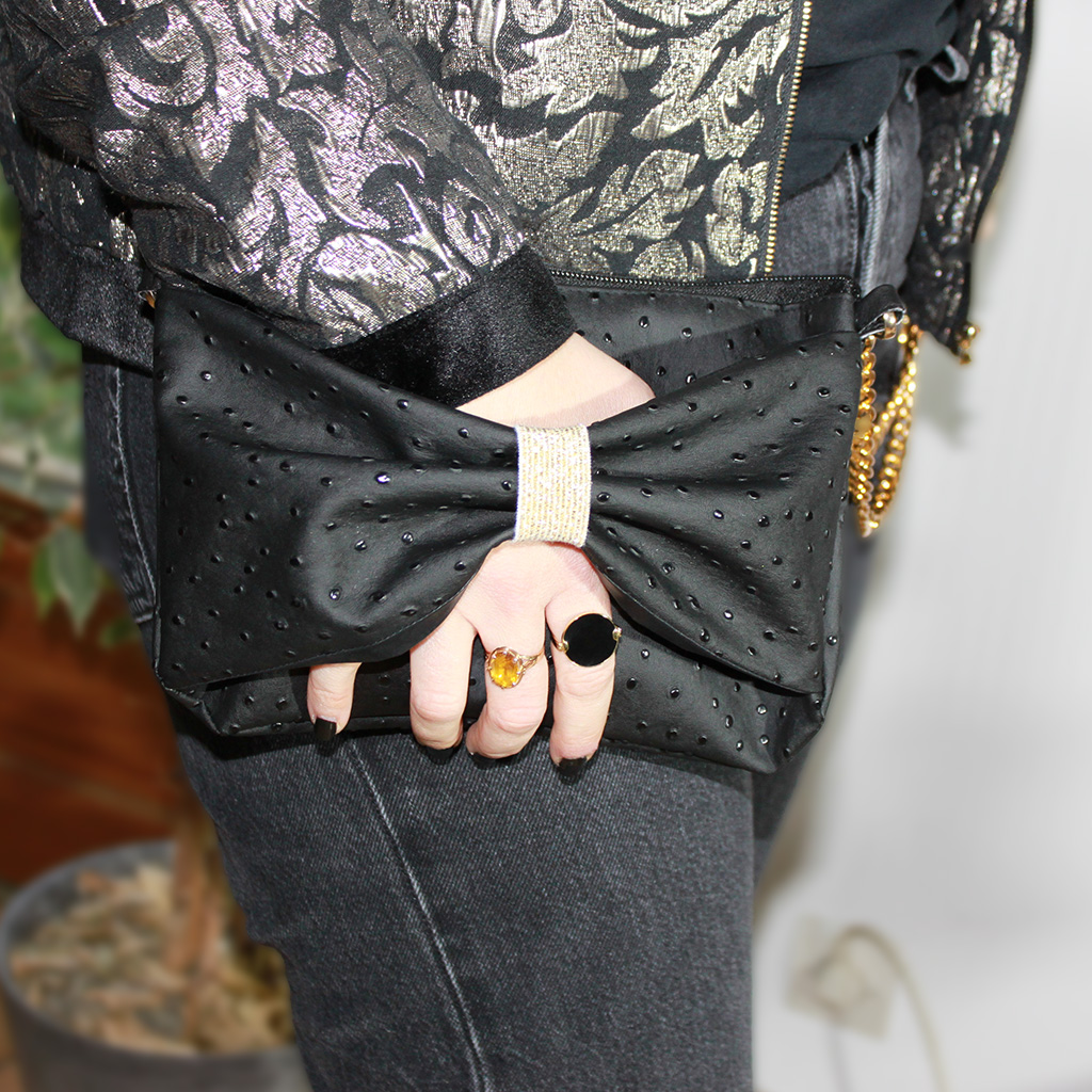 Pour une touche encore plus élégante, la pochette peut être tenue en passant la main sous le nœud, offrant une prise en main naturelle et raffinée, idéale pour une sortie, un événement ou une occasion spéciale.