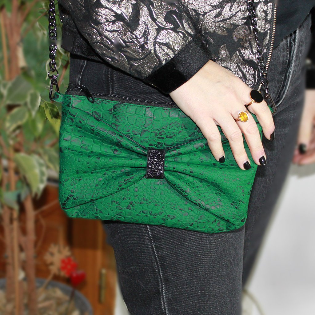 Ingénieuse et modulable, la partie du nœud peut se retourner, offrant ainsi deux styles différents en un seul accessoire : un look plus structuré ou une allure plus douce et originale, selon vos envies. Sa anse amovible permet également de transformer facilement la pochette pour s’adapter à chaque occasion.